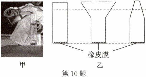 10.(创新实验)如图甲所示,在一段粗管的下端蒙上橡皮膜,并将水注入管内至约1/3处,观察橡皮膜的形状变化,再将水注入管内至约2/3处,再次观察橡皮膜的形状变化。请回答下列问题:
