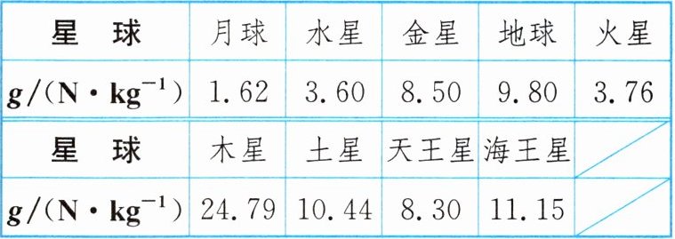 (2)科学家还发现,跟地球上一样,在其他星球上,物体也会由于星球对它的吸引而受到力的作用。下表为不同星球上g的大小。若将体积为$100cm^3,$密度为$0.8g/cm^3$的物体带到火星上,则它在火星上受到的重力为多少牛?