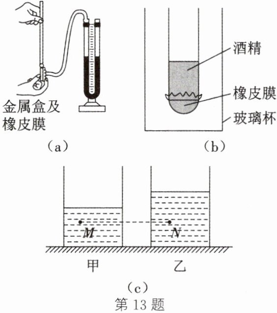 (填“向下凸起”“向上凸起”或“相平”)。【拓展提升】图(c)是两个完全相同的圆柱形容器,分别装有甲、乙两种不同的液体,在距离容器底同一高度处分别有M、N两点。