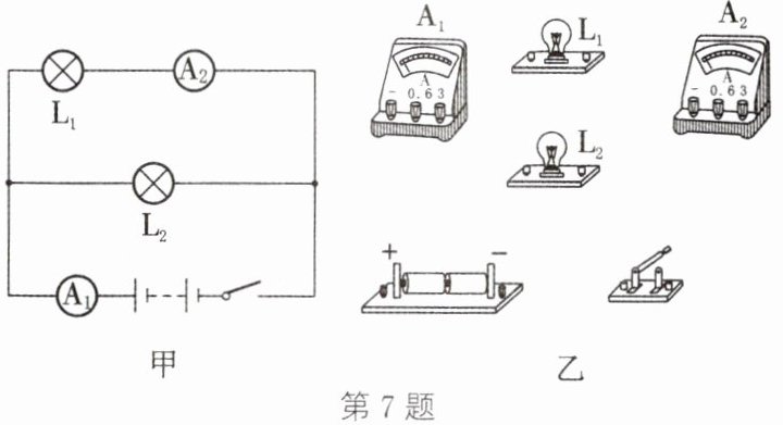 7. 按照图甲的电路图,用笔画线代替导线,把图乙中的实物连接起来。(注:两电表均选择大量程)
