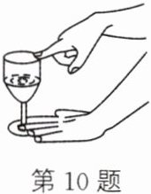 10. 如图所示,把一个装有少量水的杯子放在桌面上,用一只手按住底座,将另一只手的手指润湿后沿着杯口边缘摩擦使其发出声音。下列关于水杯发声的说法,正确的是(