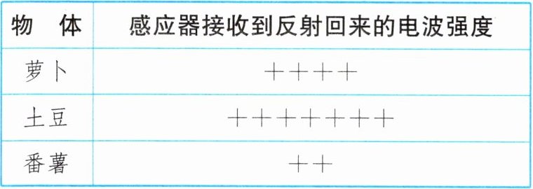 来比较三者导电能力的大小。(3)在实际操作过程中,小明发现实验现象不明显,无法达到实验目的。他通过查阅资料发现,有一种电波感应器(如图乙所示),能向物体发射电波,并根据物体反射回来的电波强弱来判断物体的导电能力,物体对电波反射越弱,则导电能力越强。若向萝卜、土豆、番薯发射相同强度的电波,反射回来的电波结果如表所示(“+”越多,电波越强),则萝卜、土豆、番薯中导电能力最强的是