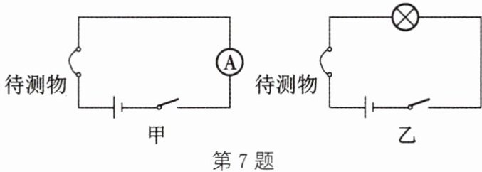7. 在研究各种物质的导电能力时,两名同学分别将灵敏电流表和小灯泡连入电路来检测物质的导电能力,如图所示。交流实验方案后,他们达成的一个共识是两种方案都存在缺陷。请你试着帮他们补充完整。