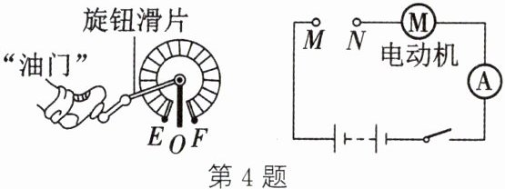 4.(2024·金华义乌三模)电动汽车利用旋钮变阻器实现对转速的控制,车速仪由电路中的电流表改装,图中O、E、F为变阻器的三个接线柱。驾驶员踩下“油门”,旋钮滑片逆时针转动,车速仪示数变大。则与M、N相连接的是(