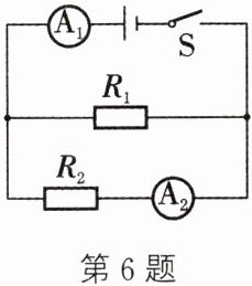 6. 如图所示的电路中,电源电压为 18 V 且保持不变,电阻$ R_2$为 15 Ω。闭合开关 S,电流表$Ⓐ_1$的示数为 1.8 A。求: