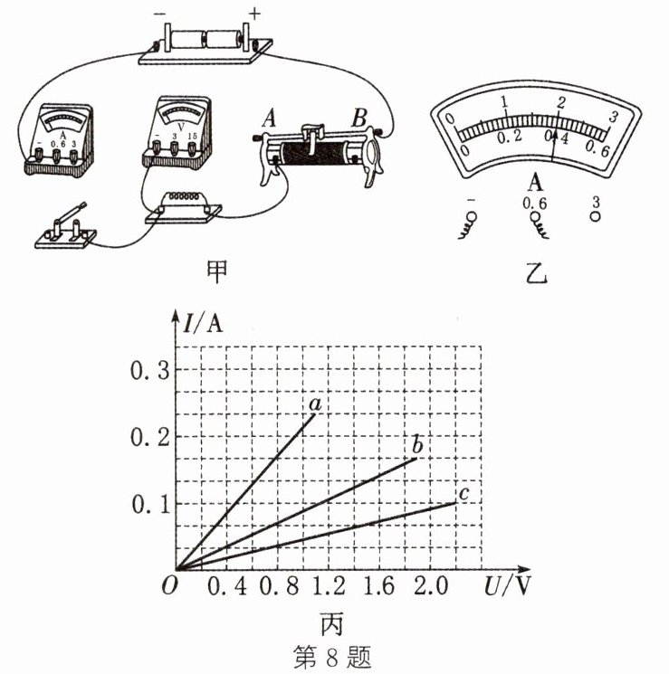 ,记录电流表的示数。(4)图丙a、b、c三条图线是其他三组同学根据所测得数据描绘 的I-U图线。单独分析每条图线,可以得到的结论是
