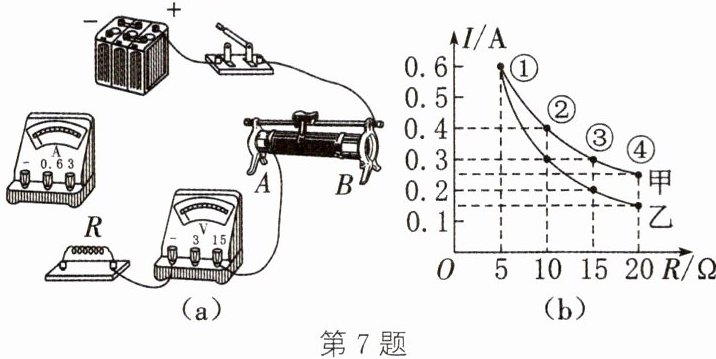 (3)排除故障后,同组甲、乙两名同学进行了实验,并绘出I-R图像如图(b)所示,其中________ (填“甲”或“乙”)同学实验操作是符合要求的,他第②次测量时电压表的示数为________ V。