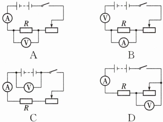 1. 利用电压表与电流表测电阻的方法叫作“伏安法”,下列属于“伏安法”测电阻R的电路图的是(