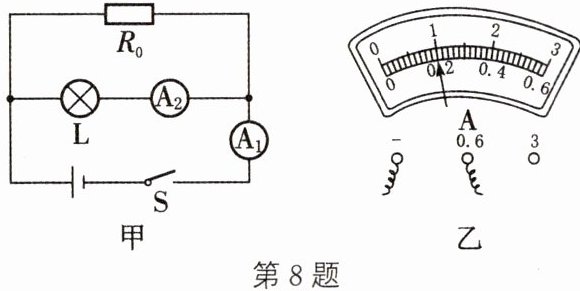 8. 在“测量小灯泡电阻”的实验中,因缺少电压表,小扬利用两个电流表和一个已知阻值为5Ω的电阻$R_0$,同样测出了小灯泡的电阻,原理如图甲所示。闭合开关,小扬读出电流表