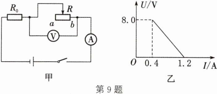 9. 如图甲所示,电源电压恒定,R₀为定值电阻。将滑动变阻器的滑片从a端滑到b端的过程中,电压表示数U与电流表示数I之间的关系图像如图乙所示。求: