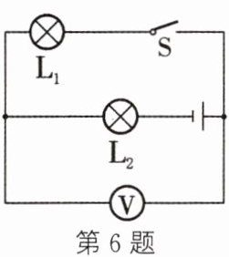 6. 图中电源电压为$4.5 V,L_1、$$L_2$是小灯泡,当开关S闭合时,电压表的示数为1.5 V,若忽略温度对灯丝电阻的影响,则(
