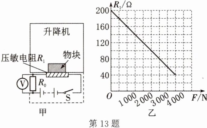 13. 如图甲所示为升降机电路的部分原理图。电源电压恒为6 V。R₀为定值电阻,电压表量程为0~3 V,压敏电阻$R_1$的阻值与所受压力大小的关系如图乙所示(压敏电阻不受压力时电压表示数为2 V)。