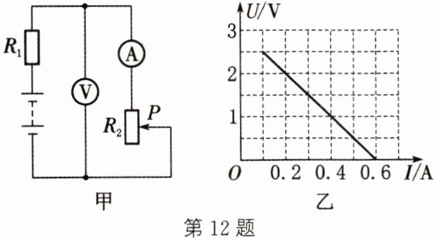 12. 如图甲所示的电路,滑动变阻器$R_2$的滑片P从下端往上端滑动的过程中,电压表与电流表的示数的变化关系如图乙所示。求: