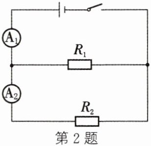 2. 在如图所示的电路中,电源电压恒定,电阻$R_1= R_2。$当闭合开关时,若发现两个电流表示数相等,且均在正常值范围内,则出现的故障是(