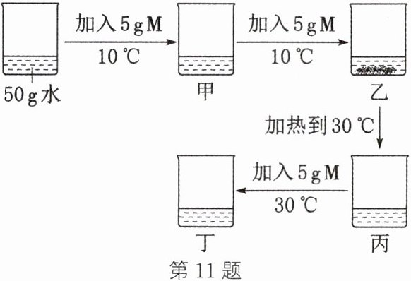 11. 同学们用固体M做了如图实验,图甲、乙、丙、丁是充分搅拌后静置的现象,请回答相关问题:(忽略水的蒸发)