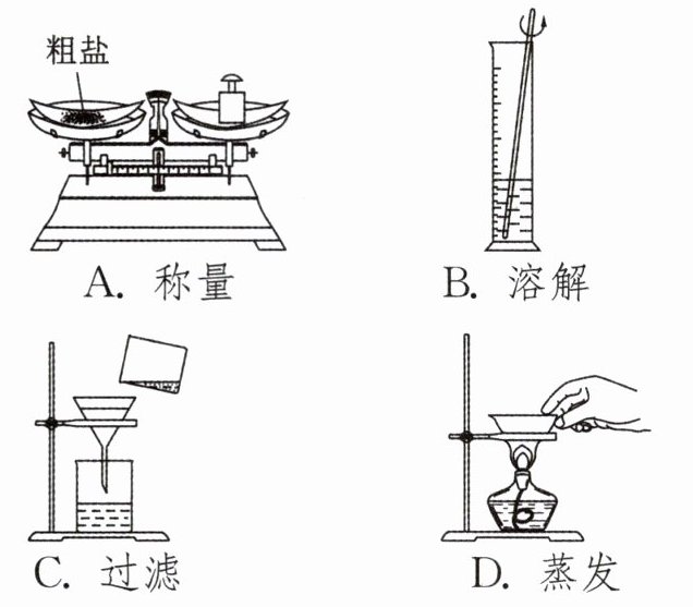 解:A选项,托盘天平称量时应遵循“左物右码”原则,图中粗盐放右盘,砝码放左盘,操作错误;