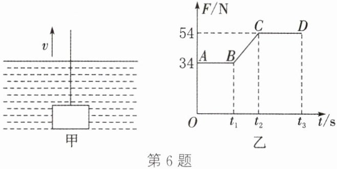 6. 如图甲所示,长方体金属块在细绳竖直向上的拉力作用下,从水中开始一直竖直向上做匀速直线运动,上升到离水面一定的高度处。图乙是绳子拉力F随时间t变化的图像,$g取10\ N/kg$。根据图像信息,下列判断不正确的是(不计阻力) (