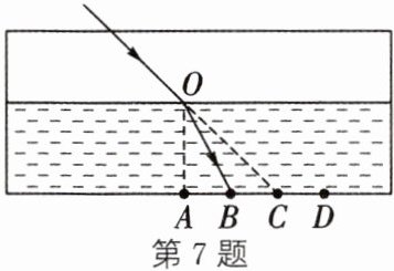 7. 如图所示,一束激光由空气射入装有水的容器中,折射后射在容器底部的B点,利用注射器将容器中的水取走一部分,其他条件不变,则激光射在容器底部的位置在 ( )