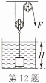 12.如图所示,底面积$S= 1000cm^2、$高h= 2.1m圆柱形容器盛水,水面高度H= 18m。水中棱长0cm立方体物块(图未按比例画),物块密度ρ物= 。开始时,物块在滑轮组(不计摩擦及绳子滑轮重力)作用下静止水中,下表面与容器底面未接触,现拉着物块以v= 0.2m/s速度匀速上升10s。图中各绳子不会被拉断,物块匀速上升过程中,拉力F最大值最小值分别多少?(不计水阻力,g= 取N/kg,ρ水= )。