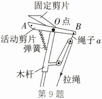 9.(科技民生)(2024·宁波镇海期中)如图所示是高空修剪树枝的工具——高枝剪。当树枝进入两剪片形成的刀口中,拉动拉绳就能轻松剪断树枝。为了剪断较粗较硬的枝条,除了增大拉力外,还应尽量将枝条靠近______