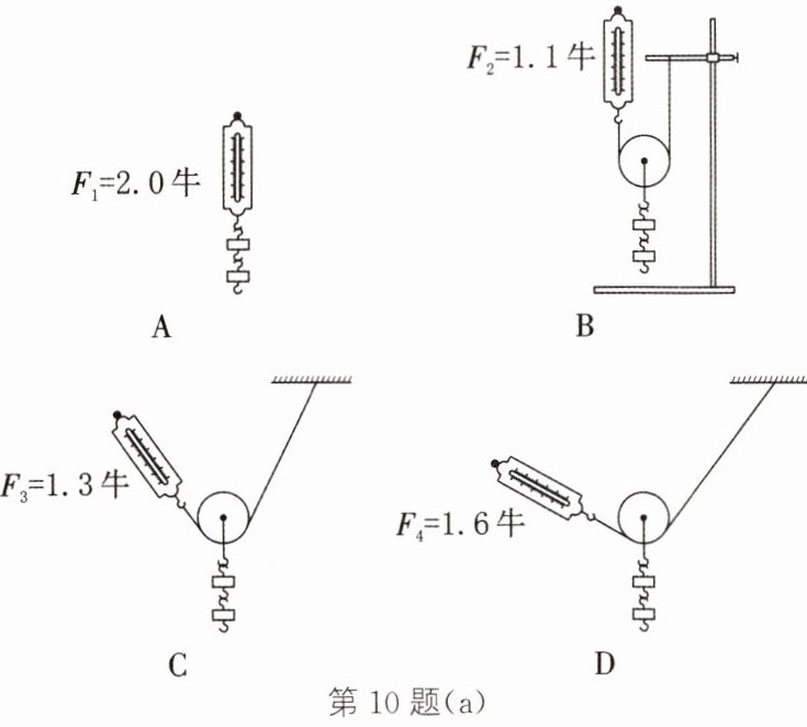 10. 在探究动滑轮使用特点的实验中,各小组按照图(a)所示进行实验,每个小组的实验器材都相同,每次都匀速提起钩码,实验中不计绳重和摩擦。