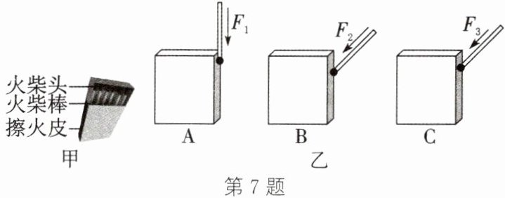 7. 火的使用推动了人类文明的进步。随着科技的发展,生活中的点火方式越来越便捷多样,但火柴(如图甲)仍是实验室常用的点火工具。火柴引燃过程:划动火柴→擦火皮(含微量易燃物)产生火星→引发火柴头燃烧。图乙是小丽设计的三种引燃火柴的方式,若$F_{1}= F_{2}>F_{3}$,且 B、C 的火柴棒与擦火皮夹角相同,则哪种方式最容易将火柴引燃?请用所学知识解释。