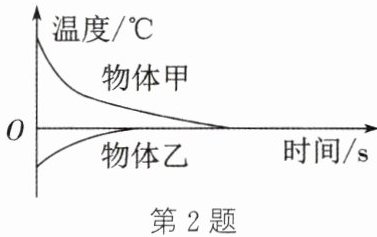 2. 将冰块放在泡沫箱中可制成简易“冰箱”,把一瓶饮料放入“冰箱”后,冰块和饮料的温度随时间变化的曲线如图所示,在两物体温度达到相同之前,下列说法正确的是 (