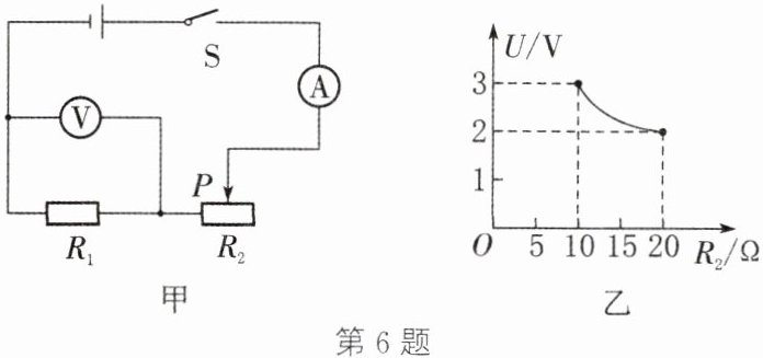 6. (2024·淮安)如图甲所示,电源电压保持不变$,R_1$为定值电阻,滑动变阻器$R_2$的最大阻值为20Ω。电压表量程为0~3V,电流表量程为0~0.6A。在保证电路各元件安全的前提下,电压表的示数随滑动变阻器$R_2$阻值变化的关系图像如图乙所示。下列说法中正确的是 (