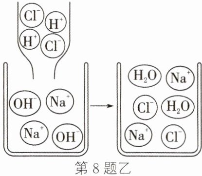 。(2) 盐酸和氢氧化钠反应的微观原理如图乙,据此判断该反应前后没有变化的离子是