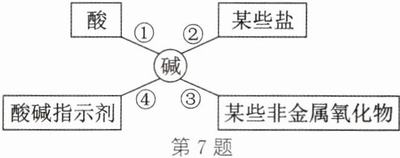 7. 酸、碱在生活、生产中应用广泛,使用时必须十分小心,为了便于理解和记忆,小丽总结了碱的化学性质如图所示,请你根据要求回答下列问题: