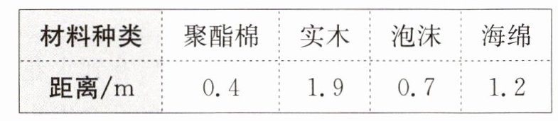 2.(2024·长沙周南集团期中)小阳在“跨学科实践:制作隔音房间模型”中,先进行了隔音材料的隔音性能的探究。他将声源放在鞋盒内,其四周先后铺满厚度相同的四种隔音材料,让人边听声音,边向后退,直到听不见声音为止。然后测量刚好听不到声音的距离,同时将得到的数据记录在下列表格中。