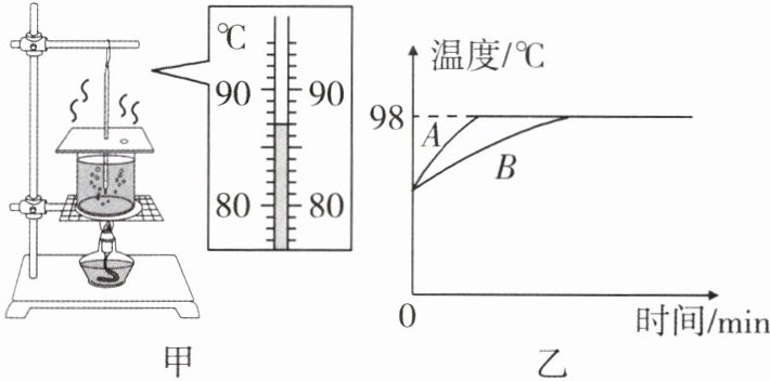 $^{\circ}C$。(2) $A$、$B$ 两组同学用相同的加热装置完成实验后,画出的图像分别是图乙中的 $A$ 和 $B$,分析图像可知:水在沸腾过程中温度