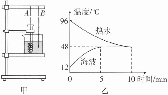 7. (2024·黄石期中模拟)如图是小明用水浴法探究海波熔化特点的实验装置,小明将装有海波的大试管放入热水中(如图甲)。根据温度计 $A$ 和 $B$ 的示数,绘制了海波和热水的温度随时间变化的图像(如图乙)。下列关于图像解读不正确的是(