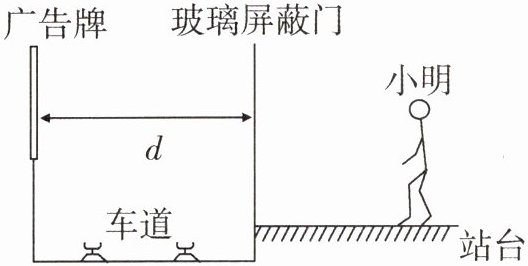 12. 如图所示,小明站在地铁站台上,他透过玻璃板制成的屏蔽门,可以看到车道另一侧竖直墙壁上的广告牌及自己在玻璃屏蔽门后面的虚像。小明根据该现象设计了在站台上粗测玻璃屏蔽门到车道另一侧广告牌之间距离 $ d $ 的实验。实验步骤如下,请完成相关内容。