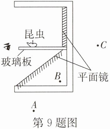 9. (2024·白城期中模拟)如图是用两块平面镜制作的能同时观察昆虫背部和腹部的观察箱,昆虫经下方平面镜所成的像在图中的