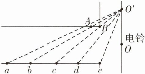 8. 一块仪容镜放在某学校走廊的 $ AB $ 处,仪容镜靠墙而立,镜面与墙壁平行,在另一面墙壁上的 $ O $ 处悬挂一电铃,如图所示。为了总能看到电铃通过仪容镜所成的像 $ O' $,小强同学沿着走廊的 $ ae $ 直线走动,若将人和电铃各自看作一个点,则小强同学所在的区间是(