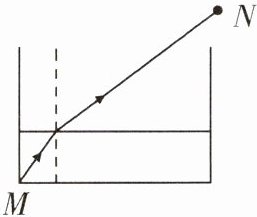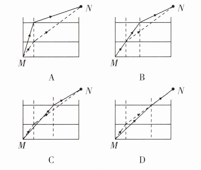 5. (2024·南京金陵汇文学校期中)如图是小明眼睛在 $N$ 点看到鱼缸内 $M$ 点处鹅卵石的光路图。鱼缸内注入更多水后,小明的眼睛在 $N$ 点仍然可以看到鹅卵石。选项中带箭头的虚线代表原来的光路,能正确反映水变多后小明看到鹅卵石的光路图是(