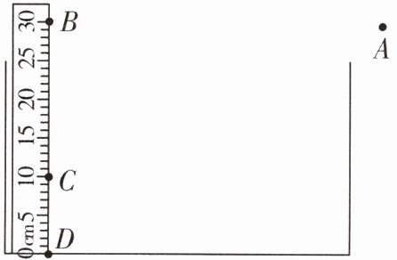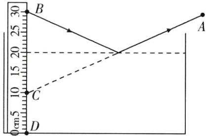 7. (2024·青岛城阳一模)小东为了研究光的反射和折射现象,将刻度尺竖直插入容器的水中,如图所示。从 $A$ 处向水中看去,看到刻度尺上 $B$ 点在水中所成的像位于 $C$ 点,同时看到水中 $D$ 点的像也位于 $C$ 点, $D$ 点的像是______像。据此请完成以下作图。(1)用虚线画出水面位置。(2)完成看到 $B$ 点的光路图。