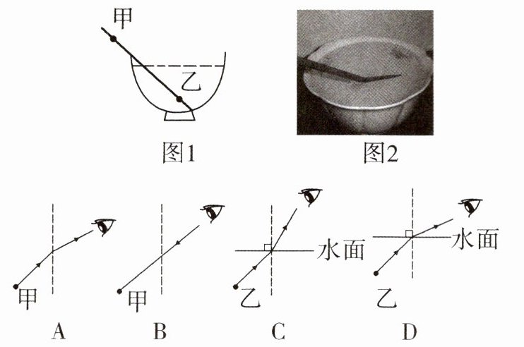 2. 标有甲、乙两点的筷子放在空碗中如图 1 所示,向碗中加水至虚线处,观察到如图 2 所示场景,此时看到筷子上的甲点或乙点,光的传播路径正确的是(