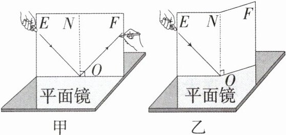 ,并记录下来.(3)在图甲实验的基础上,以$ON$为轴,把纸板$NOF$向后折,在纸板上看不到反射光,如图乙所示,这表明:在反射现象中,反射光线、入射光线和法线在