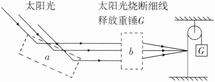 9.(2024·苏州姑苏振华中学期中)如图所示是小明自制的游戏打桩机的示意图,它利用光学元件改变太阳光的传播方向,从而烧断细线,使重锤下落打在桩上。图中元件 $ a $ 为