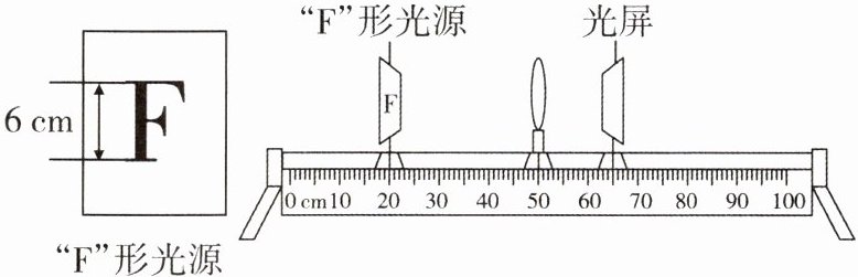 1. (2024·贵州中考)如图所示,用焦距为10 cm的凸透镜、高度为6 cm的“F”形光源、光屏和光具座等器材探究凸透镜成像大小的变化规律,通过测量像的高度反映像的大小。