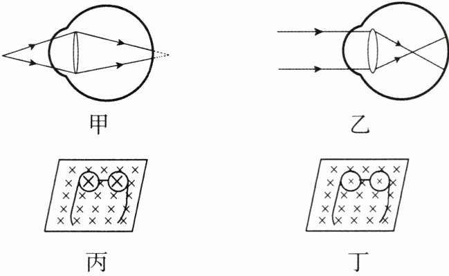 3. (2024·宜宾中考)据专家介绍,12~18岁是青少年近视的高发期,爱眼护眼势在必行。如图所示,图______(选填“甲”或“乙”)表示近视眼成像原理,应佩戴图______(选填“丙”或“丁”)的眼镜进行矫正。