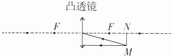 (2)与物比较,物体 $ MN $ 经凸透镜成______(选填“放大”或“缩小”)、______(选填“正立”或“倒立”)的像.
