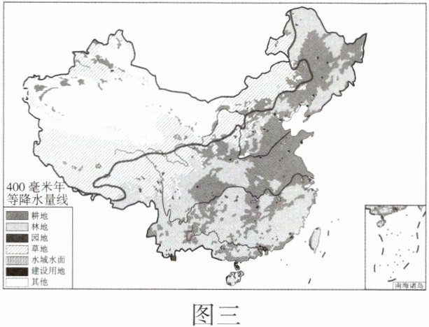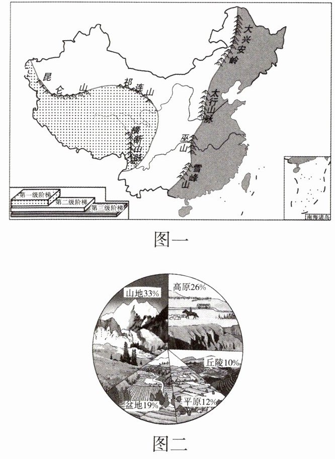 材料 图一为中国地势三级阶梯示意图,图二为中国陆地地形类型构成图,图三为中国土地利用类型分布图。