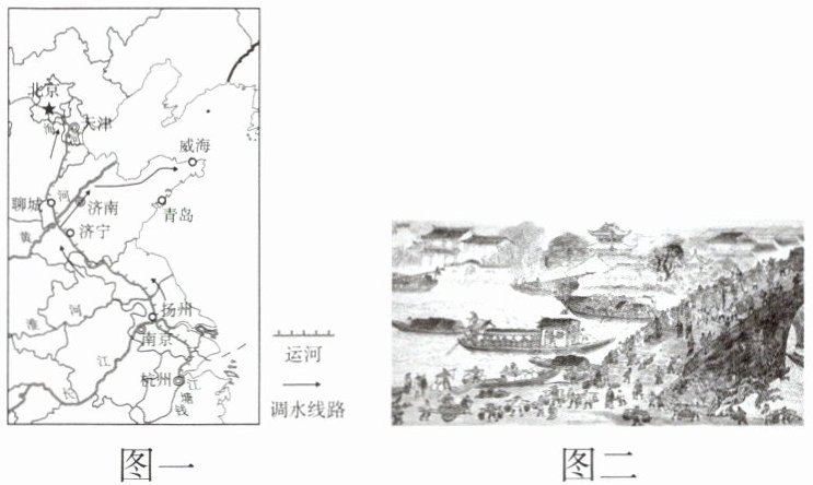 材料一 京杭运河、南水北调东线工程示意图(图一)和大运河“漕运”画作(图二)。