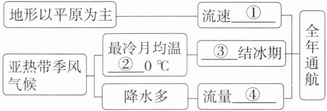 (2) 分析京杭运河南方河段全年通航的原因,补充下面框图内容。