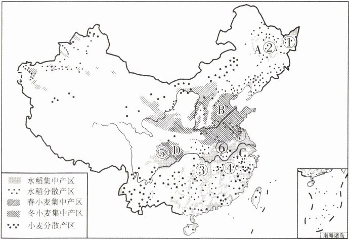 (2)分布:南方属______集中产区,北方属______集中产区,______、豆类、薯类的种植则相对分散。A______平原、B______平原、C______平原、D______盆地等地是我国重要的粮食产区。