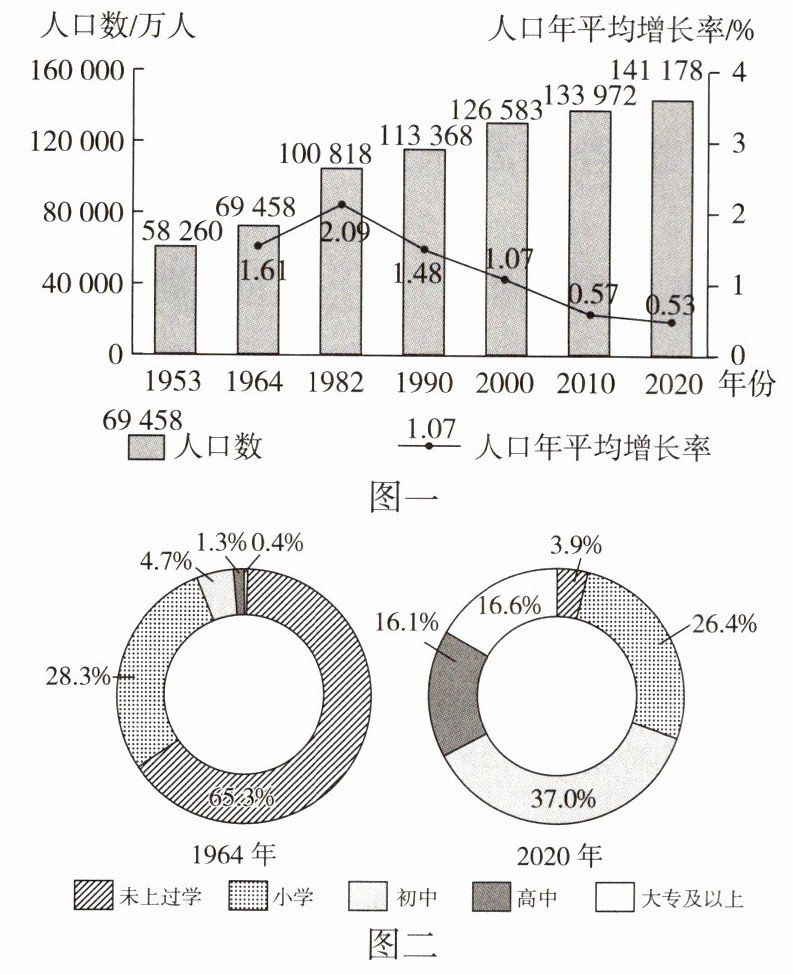 (济南中考精选)中华人民共和国成立后,我国人口数量和人口素质都发生了显著的变化。图一为全国人口数和人口年平均增长率图,图二为1964年和2020年全国6岁及以上人口受教育程度构成比例图(注:人口数据未包括港、澳、台)。据此回答13~14题。