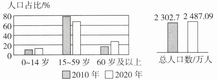 读我国某市2010年和2020年人口数据柱状图,回答11~12题。